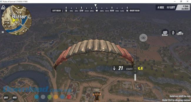 Hoặc nhân vật sẽ tự động bung dù khi xuống đến gần mặt đất, bạn có thể điều khiển di chuyển bằng cách bấm phím W S A D.