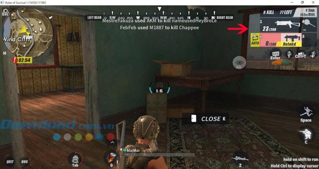 Ở khúc giữa bên trên màn hình bạn sẽ thấy những ai đang giết ai, bằng vũ khí gì, cạnh đó bên góc trái là bản đồ mini, và bên phải là phần hiển thị trang bị của bạn. Ở dưới là thanh HP (Máu) và một số phím tắt đi kèm hình ảnh minh họa.
