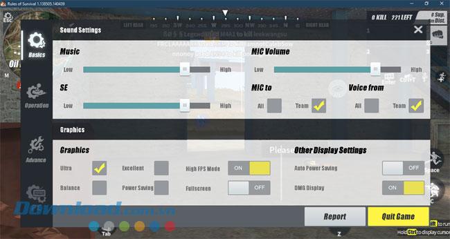 Bấm phím Esc để thay đổi thông số của game như âm thanh, đồ họa, âm thanh của MIC ở mục Basics. Còn một số phím bấm khác bạn có thể tham khảo đầy đủ ở bài viết Tổng hợp phím tắt chơi game Rules Of Survival.