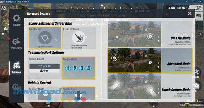 Advanced Settings là mục chỉnh sửa biểu tượng trong game, biểu tượng khai hỏa, dấu hiệu đồng đội, điều khiển phương tiện... ở cột bên trái, cột bên phải là những mode điều khiển dành cho Mobile.