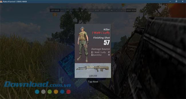 Khi bạn bị kẻ địch tiêu diệt, sẽ có một bảng thông tin hiện ra, bao gồm tên, vũ khí mà kẻ địch sử dụng để giết bạn. Bấm vào Tap Next để tiếp tục.