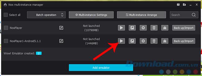 Bước 2: Tạo một máy ảo mới bằng cách click vào Add emulator và chọn NoxPlayer-Android 5.1, sau đó click chuột trái vào biểu tượng tam giác để chạy nó.