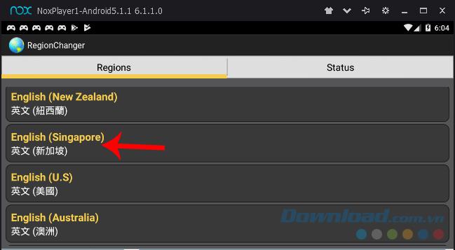 Bước 4: Khởi chạy Regionchanger trước, từ giao diện chính, các bạn kéo xuống và chọn Quốc gia đã phát hành Lineage II - Revolution. Như trong hướng dẫn này, người viết chọn English (Singapore).