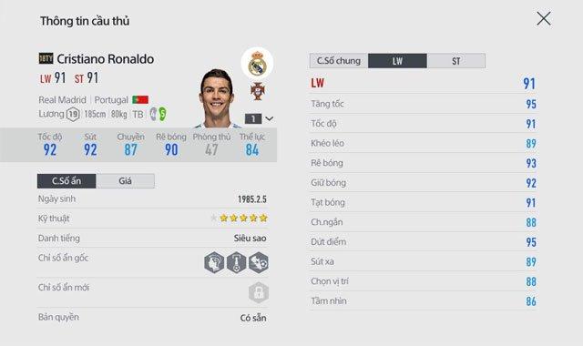 Ronaldo là tiền đạo nguy hiểm nhất hiện nay, bất cứ dàn hậu vệ nào cũng cảm thấy khiếp sợ, hoảng loạn khi Ronaldo xâm nhập được vào khu vực cấm. Suốt nhiều năm qua Real Madrid và Bồ Đào Nha luôn tôn sùng anh như 1 vị thần. Càng nhiều tuổi khả năng của Ronaldo lại càng trở nên hoàn thiện, tinh ra hơn nhưng thể lực thì cũng không hề xa sút. Chắc chắn nếu rủng rỉnh tiền thì Ronaldo là tiền đạo tuyệt đối không thể bỏ qua trong đội hình của mình.