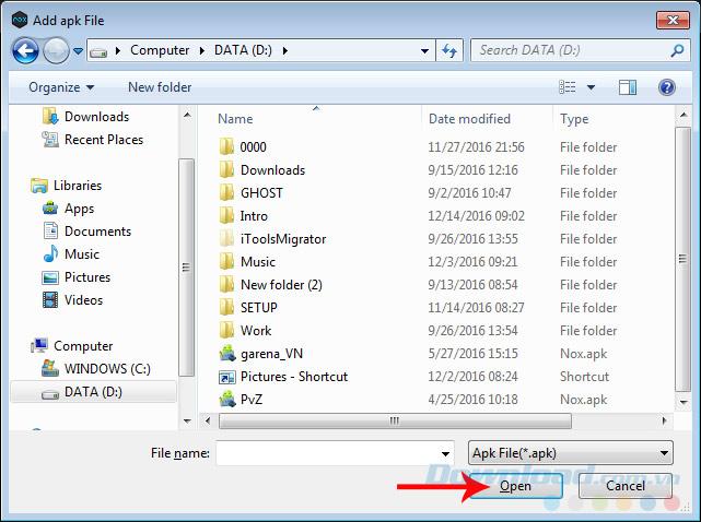 - Chuột trái vào file APK đó rồi Open (hoặc click đúp chuột trái vào đó cũng được).