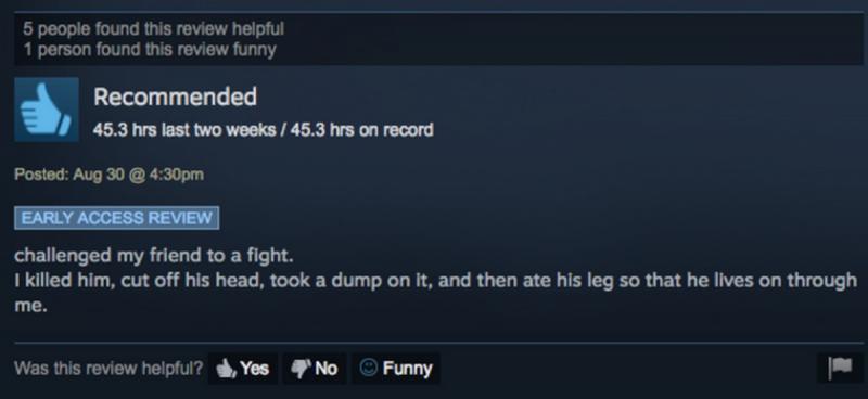 Hiện nay SCUM đang nhận được đánh giá nhiều chiều trên Steam, rõ ràng nó này không đơn giản chỉ là một trò chơi sinh tồn ngoài thế giới mở. Nếu bạn cảm thấy các trò chơi hiện tại không làm bạn thỏa mãn”thú tính” khi hành hạ kẻ thù hãy thử với SCUM. Chắc chẳng có gì có thể xúc phạm hơn là một bãi chất thải trên cơ thể của kẻ thù bị giết phải không nào?