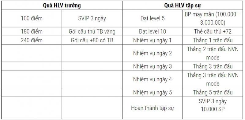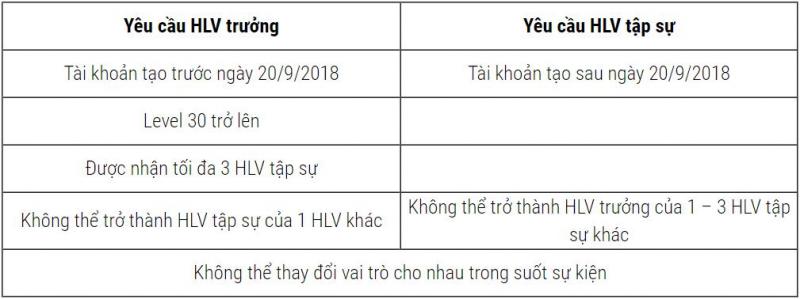 Sau khi kết bạn với nhau, đăng ký tại trang sự kiện rồi chỉ cần chăm chỉ vào game 5 ngày làm các nhiệm vụ là xong. Mỗi vai trò sẽ có các mốc quà khác nhau. Với tân binh – HLV tập sự, họ sẽ được lợi khá lớn khi vừa có mốc quà theo ngày, theo cấp độ lại có quà tổng cuối sự kiện. Trong khi đó, người chơi đóng vai HLV trưởng dù chỉ 3 phần thưởng nhưng lại có giá trị cao hơn nhiều.