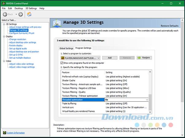 Click chuột phải vào màn hình hoặc thông qua start menu và mở Nvidia Control Panel. Đi đến Manage 3D Settings > Program Settings > Playerunknown’s Battlegrounds, cuộn xuống Threaded Optimization và bật nó sang chế độ On.