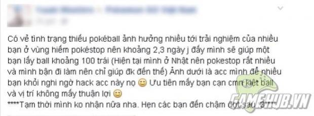 Hoặc cũng có những game thủ Việt đang sinh sống ở nước ngoài lên tiếng nhận giúp đỡ các game thủ khác trong nước bằng việc kiếm Pokeball giúp. Nhưng điều đó đồng nghĩa với việc bạn phải đưa cho người khác tài khoản game của mình, và sẽ thật khó tránh khỏi tài khoản của bạn được dùng sai mục đích. Hoặc cũng có thể xảy ra rủi ro khi tài khoản của bạn bỗng nhiên thay đổi vị trí trong một thời gian vô cùng ngắn khiến NPH nảy sinh nghi ngờ mà khóa lại.