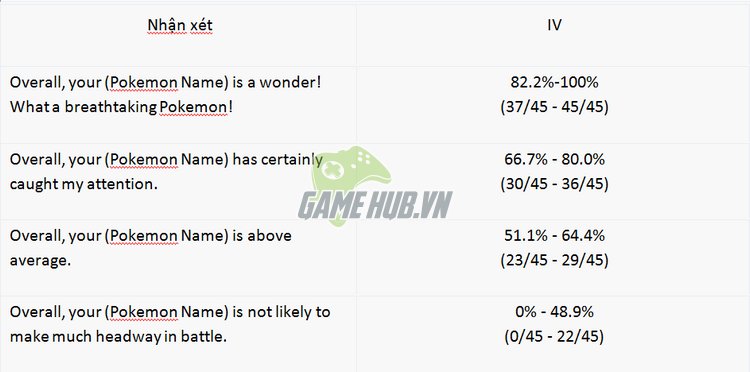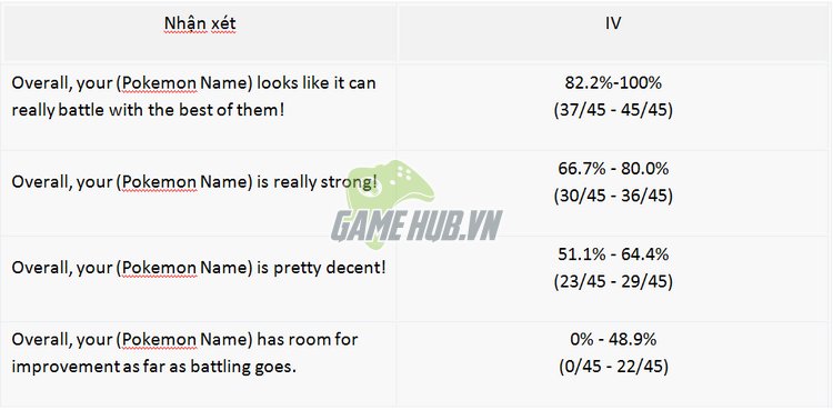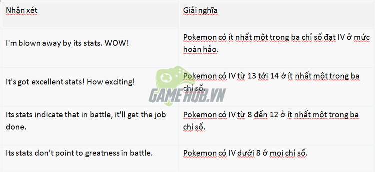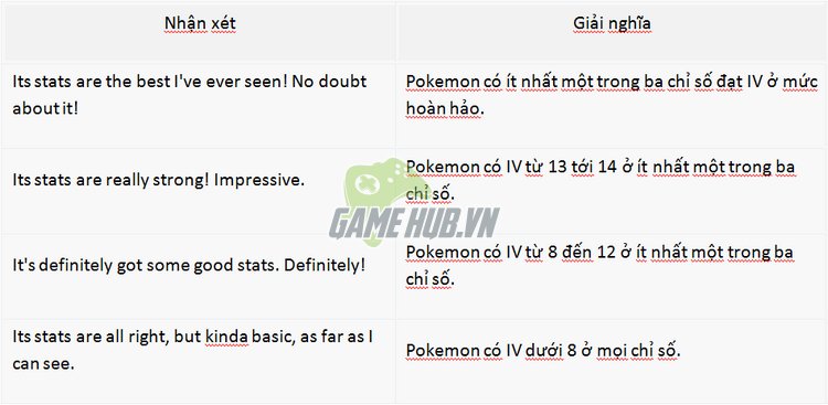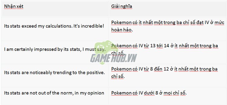 Tuy nhiên những lời nhận xét này hoàn toàn thiên về mặt câu chữ với rất nhiều thái độ biểu cảm khác nhau tùy theo mỗi Team. Chính vì thế game thủ có kỹ năng tiếng Anh chưa cao hoặc cảm thấy không thể ghi nhớ từng câu từng lời sẽ gặp khó khăn trong việc làm quen với Pokemon Appraisal.