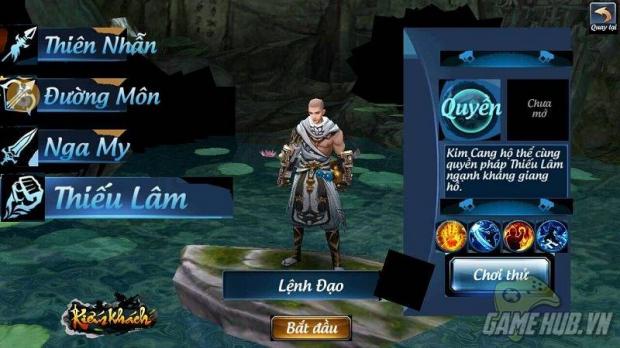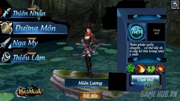 Mở đầu, người chơi sẽ được chọn lựa một trong bốn môn phái để xông pha trong Kiếm Khách: Thiên Nhẫn, Nga My, Đường Môn, Thiếu Lâm. Mỗi môn phái đều có vũ khí và hệ thống skill riêng biệt.