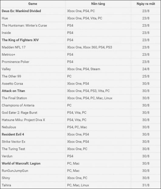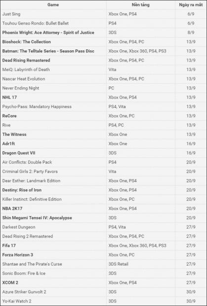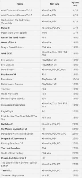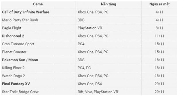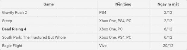 Bên dưới đây là lịch ra mắt game chi tiết từ nay đến hết năm 2016 để bạn đọc tiện theo dõi, tránh bỏ lỡ những 'bom tấn' mà mình đã mong chờ suốt thời gian qua.