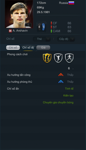 Tiền đạo người Nga là một trong những trường hợp kì lạ. Arshavin có tốc độ kinh hoàng, dứt điểm sắc bén đến ảo diệu, phản ứng nhanh nhạy, thể hiện trên sân rất tốt, ít khi ‘thọt’. Cộng với kĩ thuật 4 sao, chỉ số ẩn Tinh tế, Rê bóng 83… lối chơi của Arshavin rất mượt mà, hấp dẫn nhưng không kém phần hiệu quả. Dĩ nhiên anh cũng có điểm yếu: khả năng chơi bóng bổng rất kém với điểm nhảy, đánh đầu cùng chiều cao nhìn vào là thấy ‘nản’.