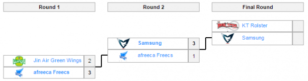 Afreeca là đội vươn lên dẫn trước sau ván 1, nhờ khả năng lằn cầu tuyết ngay từ sớm trước khi Samsung kịp tăng tiến sức mạnh để giành lại thế trận. Nhưng các ván đấu sau đó thuộc loạt Bo5 vừa mới kết thúc vào chiều tối ngày hôm qua (01/9), Samsung là đội giành thắng lợi hoàn toàn.