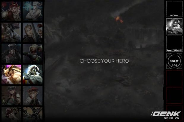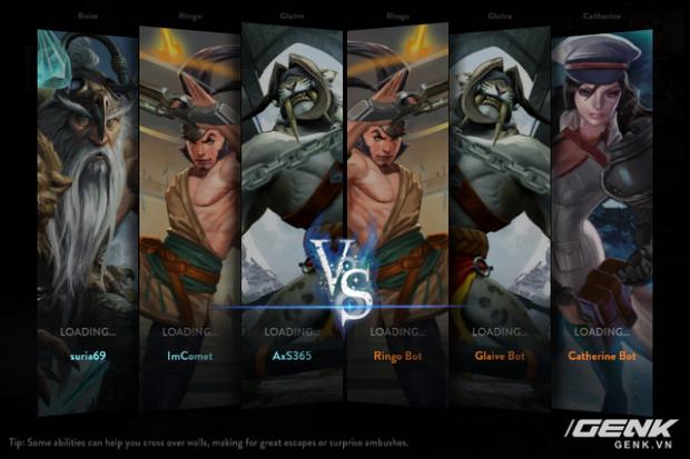 Để làm quen, tôi chơi thử màn chơi với AI để tìm hiểu. Đây là giao diện chọn tướng và vào trận của trò chơi. Nó khá dễ dùng và làm quen ngay cả khi bạn mới chơi lần đầu tiên.