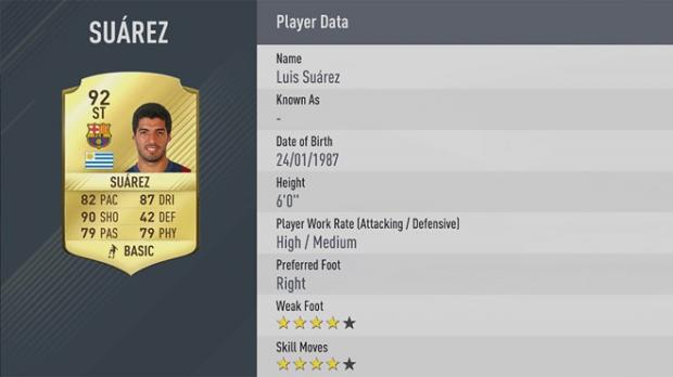 4. Luis Suarez (tiền đạo, chỉ số chung 92): Hiệu suất làm bàn của chân sút người Uruguay ở mùa giải 2015/16 thậm chí tăng gấp đôi so với năm đầu tiên chuyển sang Barca (59 bàn sau 53 trận so với 25 bàn sau 43 trận). Chỉ số của anh được tăng thêm 2 điểm so với game FIFA 16.