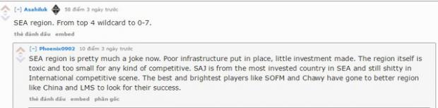 - Khu vực SEA thật lố bịch, nơi này cơ sở vật chất nghèo nàn, đầu tư ít ỏi. Các đội tuyển quá mạnh hoặc quá yếu, không tạo ra bất kỳ sự cạnh tranh nào cả. Saigon Jokers đến từ quốc gia được đầu tư mạnh nhất tại Đông Nam Á nhưng vẫn là con số 0 khi bước ra thế giới. Các tuyển thủ tốt nhất của họ như SofM hay Chawy đã đến với những khu vực phát triển hơn như Trung Quốc hay LMS để tìm kiếm thành công cho bản thân mình.