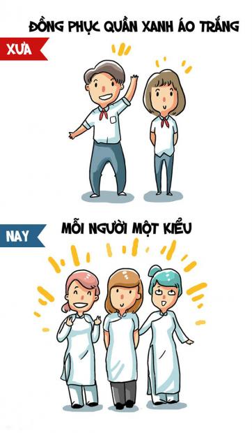 Những năm trước, đồng phục tất cả giống nhau quần xanh, áo trắng. Ngày nay, đồng phục may riêng áo dài đã có nhiều kiểu cách tân.