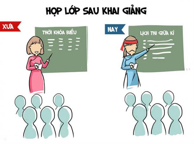 Ngày trước, kết thúc khai giảng sẽ đến phần họp lớp. Giáo viên ghi trên bảng: Thời khóa biểu năm học mới. Ngày nay, giáo viên ghi trên bảng: Những kỳ thi sắp tới (vì trước đó học sinh đã học khá dài).