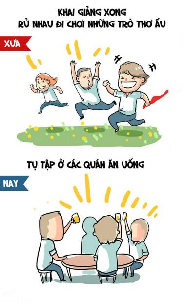 Trước kia, khai giảng xong, học sinh rủ nhau đi đuổi hoa bắt bướm, chơi những trò thơ ấu. Bây giờ, khai giảng xong, các cô cậu học trò tụ tập ở các quán ăn, uống.