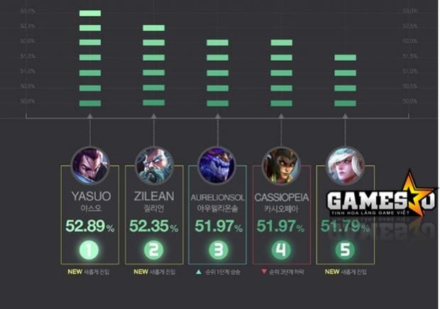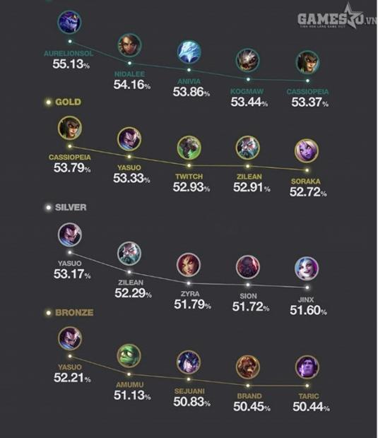 Khi mà tỷ lệ chiến thắng của hắn tại tại rank Vàng, Bạc, Đồng trở xuống lần lượt là những con số rất ấn tượng 53,33%, 53,17% và 52,21%. Tuy nhiên từ rank Bạch Kim trở lên, Yasuo bị mất hút khỏi BXH.