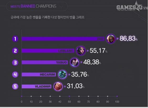 Các vị tướng còn lại trong Top List tướng bị ban nhiều nhất là Leblanc thứ 2 với 55,17%, Yasuo thứ 3 với 48,38%. Hai vị trí 4 và 5 lần lượt là hai vị tướng đang khá hot thời gian gần đây: Hecarim (35,76%), Vladimir (31,03%). Có thể thấy rõ, người Hàn e ngại như thế nào các vị tướng sát thủ, có khả năng gánh team vượt trội so với phần còn lại của Đấu Trường Công Lý.