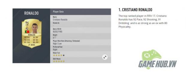 Theo đó, Lionel Messi - người trước đây luôn giữ vị trí cao nhất, đã phải nhường chỗ cho siêu sao người Bồ Cristiano Ronaldo. Cụ thể, Ronaldo hiện đang có chỉ số trung bình ở mức 94 điểm, với 92 ở 'tốc độ bứt phá', 92 ở 'sút bóng', 91 ở 'điều khiển bóng' và 80 ở 'thể lực', vượt qua Messi ở mức 93. Trong phiên bản FIFA 16, hai cầu thủ này giữ hai vị trí hoàn toàn ngược lại khi ngôi sao người Argentina có 94 điểm trong khi Ronaldo chỉ có 93.