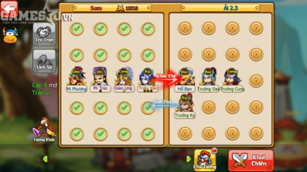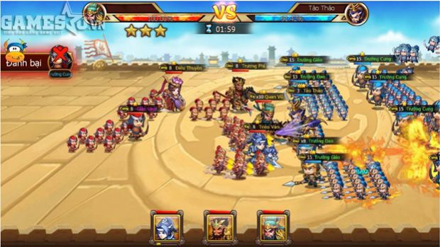 Vì là game chiến thuật, nên lối đánh nhau trong game dựa vào việc sắp xếp trận hình và canh skill tướng là chính. Các đạo quân sắp xếp theo lộ tuyến hỗ trợ nhau, có rất nhiều lựa chọn để tùy chỉnh. Khi tướng trong game full nộ, người chơi có thể chủ động cho tướng xả skill. Lối chơi này khá thích hợp với những game thủ thích thể hiện khả năng bày binh bố trận, cũng như đầu tư chiến thuật.