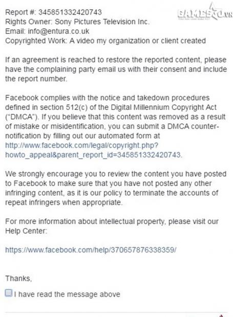 Những dòng thông báo tiếp theo cho biết, post này đã vi phạm chính sách của bên sở hữu thương hiệu là Sony Pictures Television, theo các điều khoản trong luật bản quyền nội dung số DMCA. Hành động trên có thể sẽ bị ban không thể post Status lên Facebook thêm nữa hoặc mạnh hơn là ban vĩnh viễn.