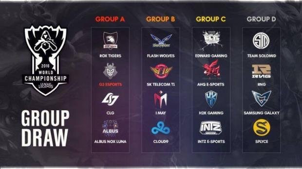 16 đội tuyển được chia thành bốn bảng đấu. Mỗi bảng sẽ có sự hiện diện của đội hạt giống số một – nhà vô địch của bốn khu vực hàng đầu bao gồm: Hàn Quốc, Trung Quốc, Đài Loan, Bắc Mỹ. Châu Âu không được xếp vào nhóm hạt giống số một bởi thành tích không tốt của G2 Esports tại giải đấu Mid-Season Invitational 2016. Sau đó, chính nhà ĐKVĐ của Châu Âu đã thừa nhận họ không thực sự tập luyện gắt gao trước thềm giải đấu diễn ra vào tháng 5 vừa qua.