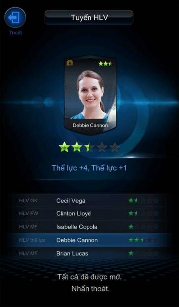 Debbie Cannon, HLV sức khỏe tốt nhất trong game được nhiều người săn đón nhất vì khi nâng điểm sao tối đa (5 sao), cô nàng có thể giúp cả đội khỏe hơn 10 điểm thể lực! Một con số rất ấn tượng với lối chơi luôn đòi hỏi nhiều sức lực của đại đa phần game thủ Việt. Tỉ lệ mở ra Cannon cực thấp đã đành, khả năng bạn tìm thấy một vị HLV Trưởng còn khó khăn hơn nữa.