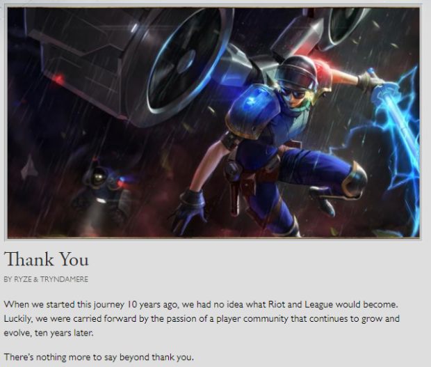 Sáng ngày hôm nay (13/9) theo giờ Việt Nam, Riot Games đã cho đăng tải một bài viết gửi lời cám ơn tới cộng đồng người chơi LMHT trên toàn thế giới đã cùng đồng hành với họ trong suốt 10 năm qua.