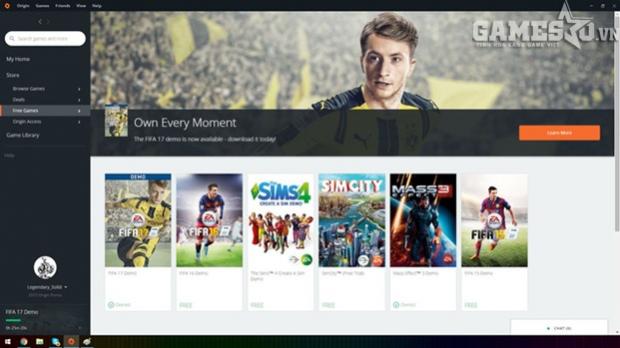 Bước 4: Lấy bản game FIFA 17 Demo miễn phí. Ở cửa sổ Origin, các bạn chọn Store/Free Games/Demos and Betas. Một trang danh sách những demo game miễn phí của EA sẽ xuất hiện, và dĩ nhiên trong đó có FIFA 17. Các bạn chọn đến hình ảnh của tựa game này và ấn nút 'Get It Free'.