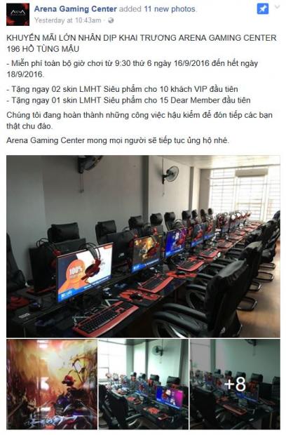 Cụ thể thì Arena Gaming Center đã ra thông báo sẽ miễn phí toàn bộ giờ chơi từ 9:30 thứ 6 ngày 16/9/2016 đến hết ngày 18/9/2016 tại cơ sở mới đặt tại Hồ Tùng Mậu. Ngoài ra, các game thủ nạp VIP tại đây sẽ được tặng cả trang phục tướng trong game Liên Minh Huyền Thoại.