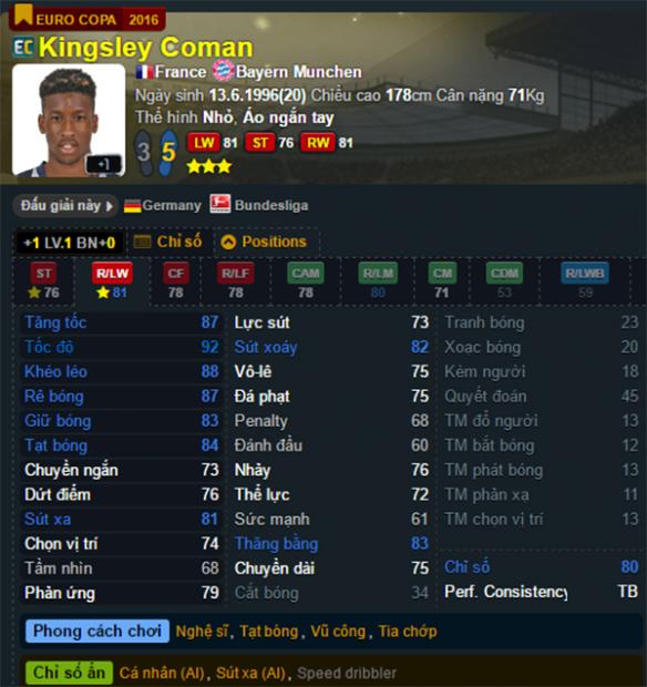 Coman là một trong vài cầu thủ trẻ dược EA ưu ái khá nhiều: chỉ số ẩn Cá nhân (AI), Sút xa (AI), 4 phong cách chơi: Nghệ sĩ, Tạt bóng, Vũ công, Tia chớp.