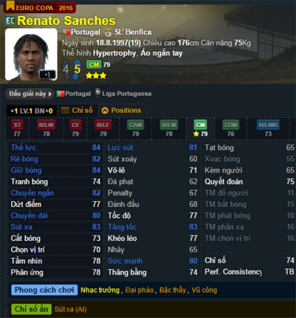 Sau bản update mới thì bạn đã có thể sở hữu Renato Sanches thẻ EC16 với chất lượng rất tốt so với thẻ mùa ‘15. Dù vẻ ngoài xấu xí nhưng Renato là một trong những tiền vệ trẻ năng nổ và hiệu quả trên sân. Quả thật là không có nhiều cầu thủ sinh năm 1997 đạt đến đẳng cấp như chàng trai này.
