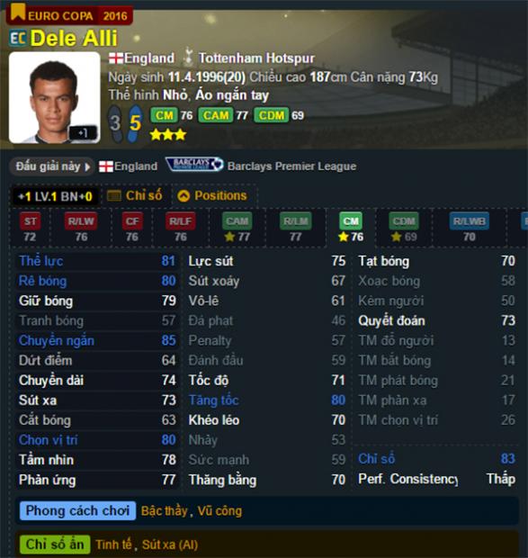 Sinh ngày 11.4.1996, cầu thủ trẻ của Tottenham Hotspur in-game có phong độ hơi thất thường một chút. Điều đó cũng dễ hiểu vì dù sao thì anh chàng vẫn còn rất trẻ. Alli không giống những cầu thủ trẻ người Anh khác. Anh không có kiểu trâu bò, chạy hùng hục và tạt như cái máy điện.