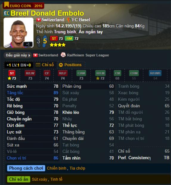 Thụy Sĩ đang được ca ngợi là một đội bóng có nhiều tài năng trẻ mới nổi thời gian gần đây. Embolo chính là một trong những sao mai lấp lánh nhất của lứa cầu thủ này. Sinh năm 1997, kỹ thuật 4 sao, khả năng tăng tốc tới 89 và chọn vị trí 86. Cực kì ấn tượng nhỉ?