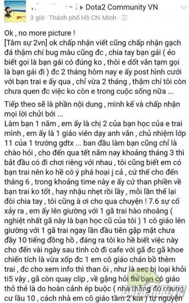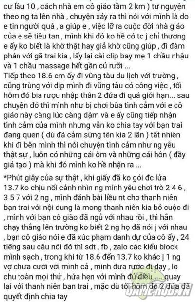 “Ngày 13 tháng 7, không chịu nổi cảnh nhìn người yêu mình chơi trò 2 4 6, 3 5 7 với hai người, mình đánh bài liều nhắn tin cho thanh niên bạn trai với nội dung là mong thanh niên kia bỏ cuộc đi, mình với bạn cô giáo đã ngủ với nhau rồi. Thì hắn chạy thẳng lên trường, không biết hai người họ đã nói gì với nhau, bạn cô giáo nói em đã xúc phạm danh dự của cô ấy. 24 tiếng sau câu nói đó thì số điện thoại, facebook, zalo các kiểu block mình sạch. Trong khi từ 18/6 đến 13/7 không khác gì một người vợ chưa cưới với mình cả. Mình đưa rước đi dạy, lo chu toàn mọi thứ, hứa hẹn với mình đủ điều.