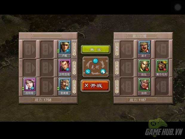 Người chơi được phép xuất tối đa 5 tướng trong một trận đấu vào một đội hình bao gồm 9 ô vuông nhỏ. Tùy vào tư duy chiến thuật và sự tính toán của người chơi mà việc bố trí tướng vào từng vị trí thích hợp để đạt được chiến thắng. Song cần phải tuân thủ theo nguyên tắc khắc chế lẫn nhau của game. Tướng Đao sẽ khắc Thương, Thương sẽ khắc Ngựa và Ngựa thì lại khắc Đao.