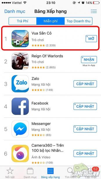 Vua Sân Cỏ “chễm chệ” trên Top 1 ứng dụng miễn phí của Appstore
