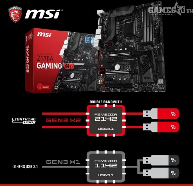 Chip điều khiển Asmedia 1142 USB 3.1 được tích hợp trên hầu hết các mainboard hiện tại sử dụng băng thông PCIe Gen2 x2 (10Gb/s) hoặc Gen3 x1 (8Gb/s) có giới hạn nhất định và do đó băng thông của giao tiếp này cũng được ấn định ở mức 10Gbps. Với Z170A GAMING M6, MSI tự hào công bố việc tích hợp chip điều khiển cao cấp hơn, Lighting Asmedia 2142 USB 3.1 Gen2 sử dụng PCIe Gen3 x2 (16Gb/s), cải thiện băng thông và tăng tốc độ truyền dữ liệu lên đáng kể khi bạn sử dụng hai thiết bị cùng lúc. Ngoài ra, Z170A GAMING M6 cũng được tích hợp cả 2 loại cổng USB là Type-A và Type-C 3.1 Gen 2 cùng lúc.
