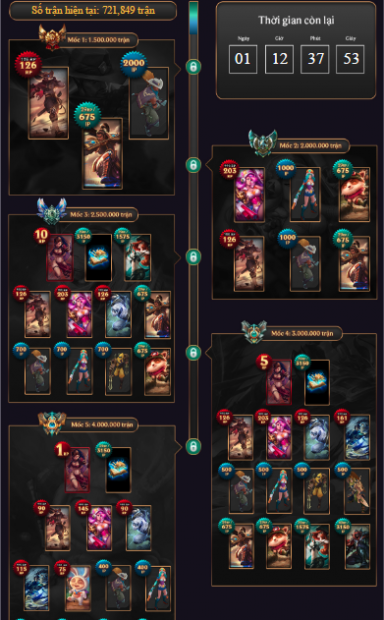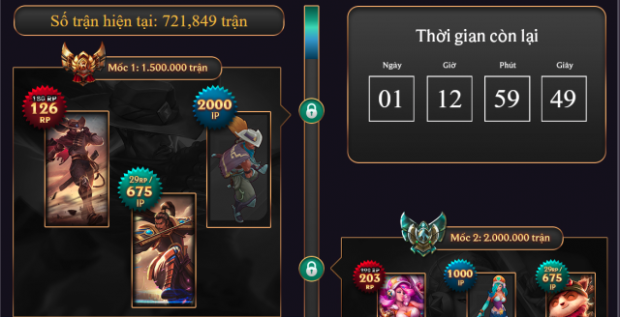 - Giảm giá 50% giá bán IP và RP của các tướng nằm trong sự kiện, mở khóa thêm ở từng mốc.