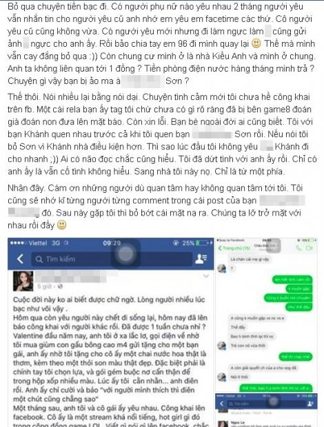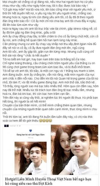 Thông tin này đã khiến cho những người hâm mộ Kz và Linh Ngọc Đàm vô cùng bất ngờ và không quên chúc mừng cho đôi bạn trẻ này. Thế nhưng vào rạng sáng hôm nay, fan của cặp đôi game thủ nổi tiếng trong làng eSports Việt này lại được một phen lao đao khi bỗng nhiên, một tài khoản facebook nhận là em gái của người yêu cũ Linh Ngọc Đàm lên tiếng kể xấu cặp đôi game thủ eSports.