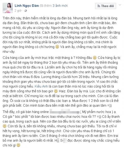 Ngay lập tức vào trưa nay, Linh Ngọc Đàm đã lên tiếng về status của cô gái 'bóc phốt' mình, dưới đây là nguyên văn đoạn chia sẻ: