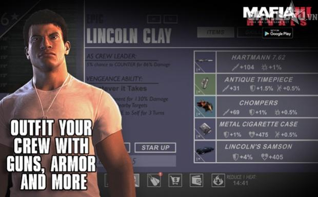Tựa game cũng cho phép người chơi trang bị cho những thành viên trong nhóm vô số 'hàng nóng' như súng ống, dao kiếm,...bên cạnh bộ áo giáp bảo vệ và quyền sử dụng các xế hộp hầm hố. Mafia 3: Rivals còn mang tới kho nhân vật đồ sộ lên tới 40 tên trùm tội phạm có số má trong thế giới Mafia 3 để người chơi tuyển lựa và nâng cấp.
