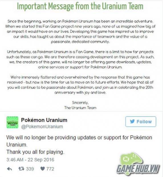Pokemon Uranium sau khi phát hành chưa lâu và cán mộc 1,5 triệu lượt tải thì ngay lập tức đã vấp phải áp lực từ Nintendo. Luật sư của Nintendo bắt đầu ra thông báo buộc đội ngũ phát triển phải hủy bỏ Pokemon Uranium từ tháng 8 và chuẩn bị mọi thủ tục để giải quyết các vấn đề pháp luật. Về phía Uranium Team, mặc dù rất tiếc đứa con của mình không thể sống lâu, nhưng vẫn phải làm theo điều mà Nintendo yêu cầu.