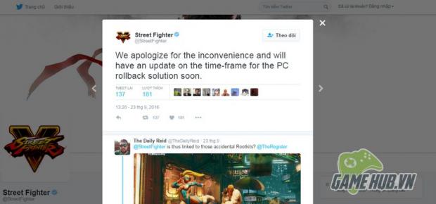 Thấy được độ nghiêm trọng của sự việc, Capcom ngay sau đó đưa ra thông báo chính thức trên trang Twitter của mình. Theo đó hãng đưa ra lời xin lỗi về sự bất tiện này và khẳng định sẽ có bản Update đưa máy tính của người chơi trở về với trạng thái trước đây. Hiện tại vào thời điểm bài viết được thực hiện Street Fighters V đã có bản cập nhật đưa về trạng thái cũ, mặc dù vẫn có một số game thủ thông báo rằng mình vẫn tìm thấy Capcom.sys trong máy tính.