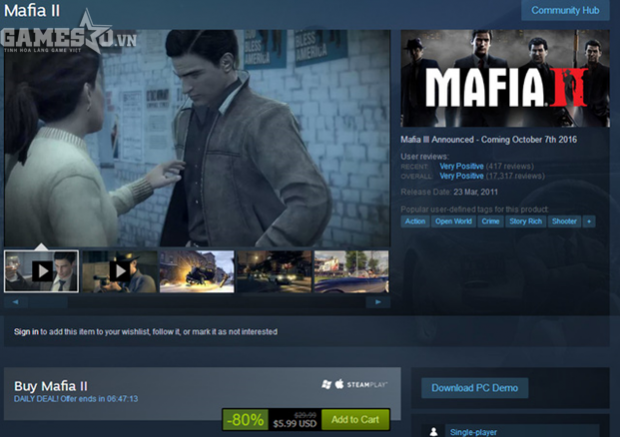 Cụ thể Mafia 2 trên Steam lúc này đang được bán với giá 6 USD (tương đương 130 nghìn đồng) thay vì 30 USD như thường lệ. tức giảm đến 80% Đợt khuyến mại này sẽ kéo dài cho đến hết 0h ngày hôm nay 26/9, vì vậy nếu đang trông đợi vào Mafia 3 sắp tới nhưng chưa có cơ hội thưởng thức Mafia 2 trước kia thì đây là cơ hội tốt để bạn làm quen với dòng game này. Ngoài ra thì phiên bản đặc biệt của Mafia 2 mang tên Digital Deluxe Edition sẽ