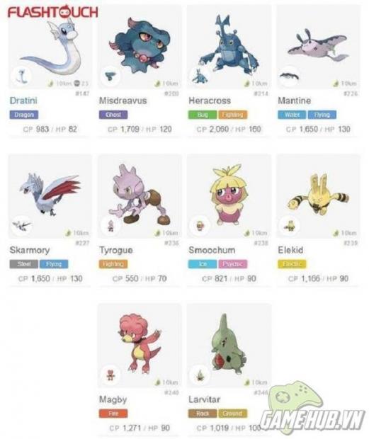 Các huấn luyện viên đương nhiên sẽ hi vọng sẽ tìm được Pokemon hiếm trong phạm vi 10km, ví dụ như Snorlax, Dratini, Aerodactyl, Onix. Sau đợt update đời thứ 2, các Pokemon trong phạm vi 10km sẽ tăng lên không ít, bao gồm cả Misdreavus, Heracronite, Mantine, Skarmory, Tyrogue, Jynx, Elekid, Magby, Larvitar...